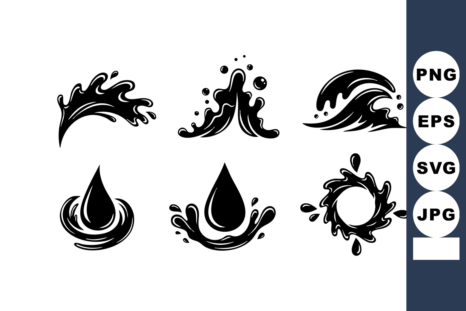 This vector illustration shows six black silhouette water splash, drops, and wave shapes in a clean style, conveying freshness and fluidity mood.