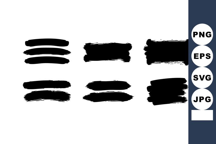 This vector illustration shows six black brush stroke designs with rough edges, suitable for creative projects and backgrounds. Simple and bold mood.