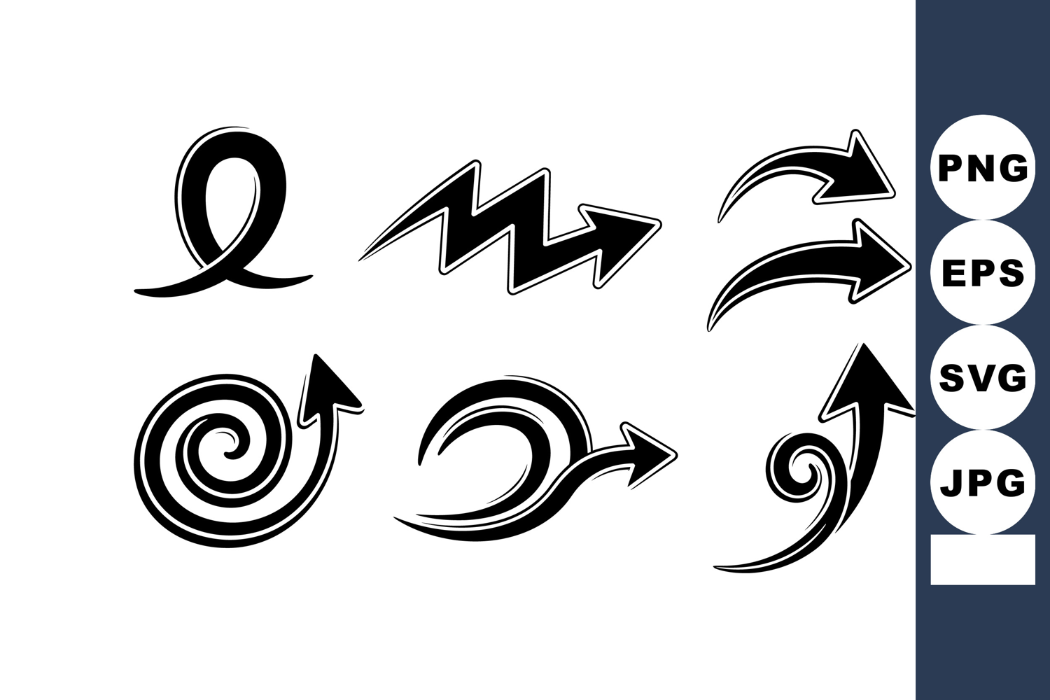 Vector collection of abstract black arrows with swirl, zigzag, and curved shapes, presented in a clean style. Energetic and dynamic mood.