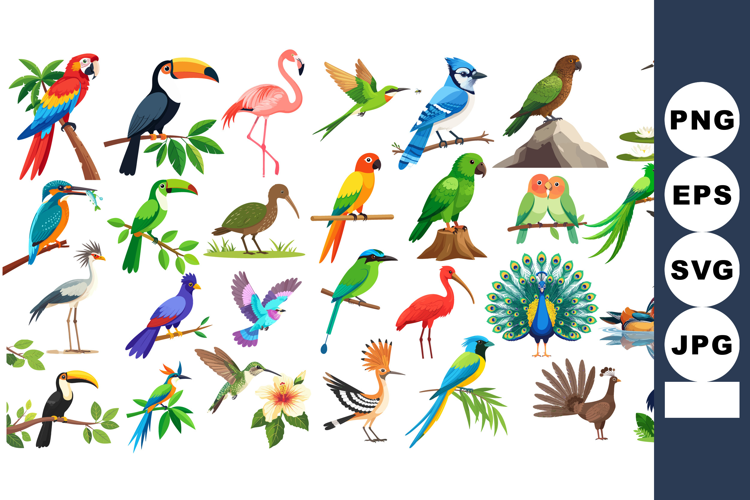 This vector illustration shows a diverse group of exotic and colorful birds perched, flying, and standing, creating an energetic, lively mood.