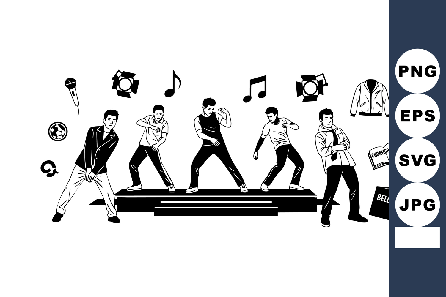 Illustration shows a retro 1950s rock and roll dance group performing with musical notes and vintage accessories, exuding energetic and lively mood.