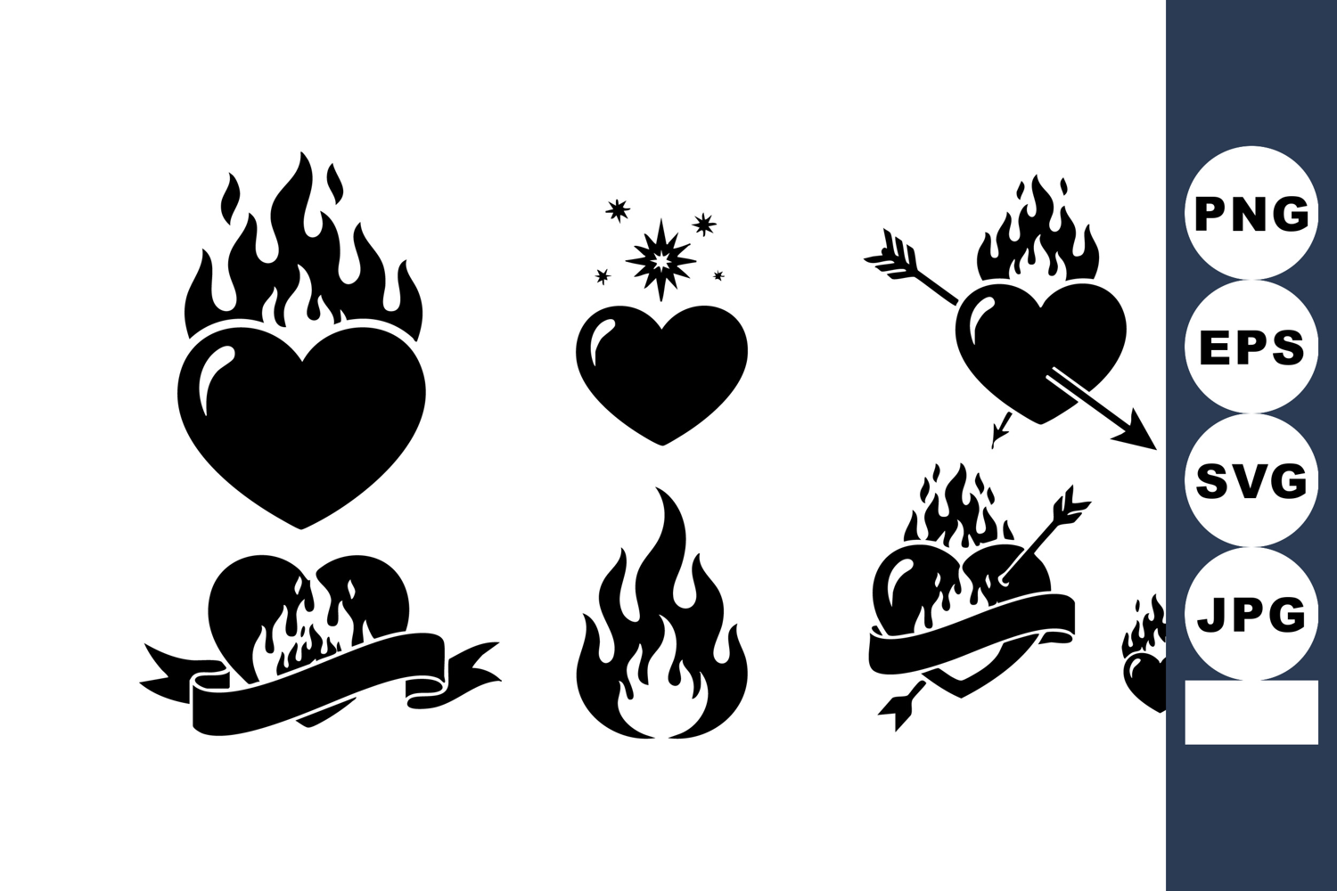 This vector features a black silhouette heart flame icon set with arrows, stars, and ribbon elements in a minimal style. Simple and bold mood.