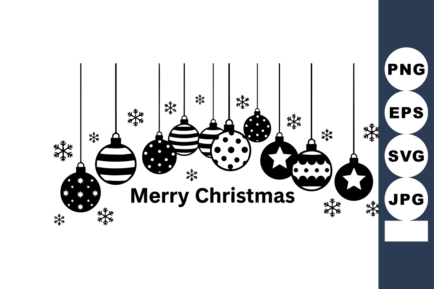Vector illustration shows black and white Christmas hanging ornaments with snowflakes and Merry Christmas text in a festive style. Cheerful mood.