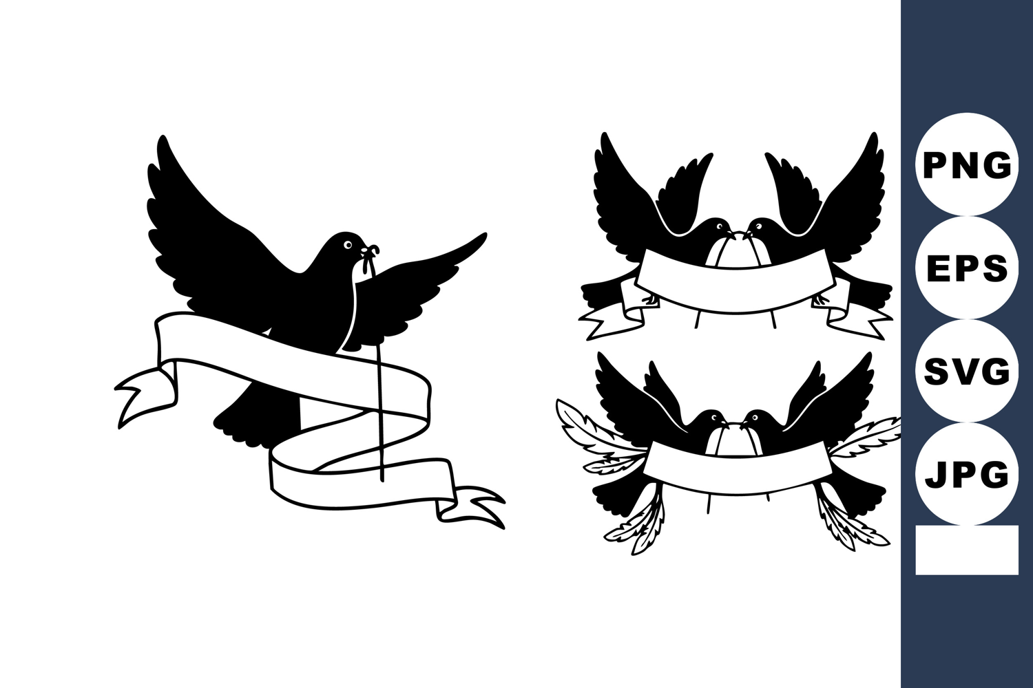 This vector features black silhouette doves holding ribbons and floral emblems, designed in a clean, bold style with symbolic peaceful motifs, elegant mood.