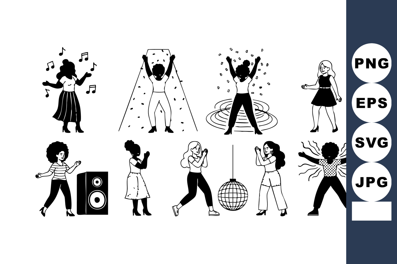 Illustration shows diverse people dancing, celebrating, and enjoying music with dynamic movements and joyful expressions in black silhouette style. Energetic mood.