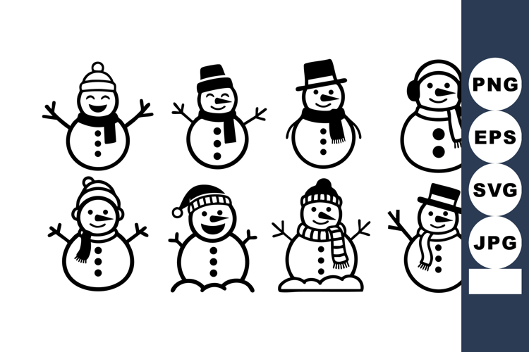 This vector shows eight snowman characters wearing hats and scarves in black and white with winter theme. Cheerful and festive mood.