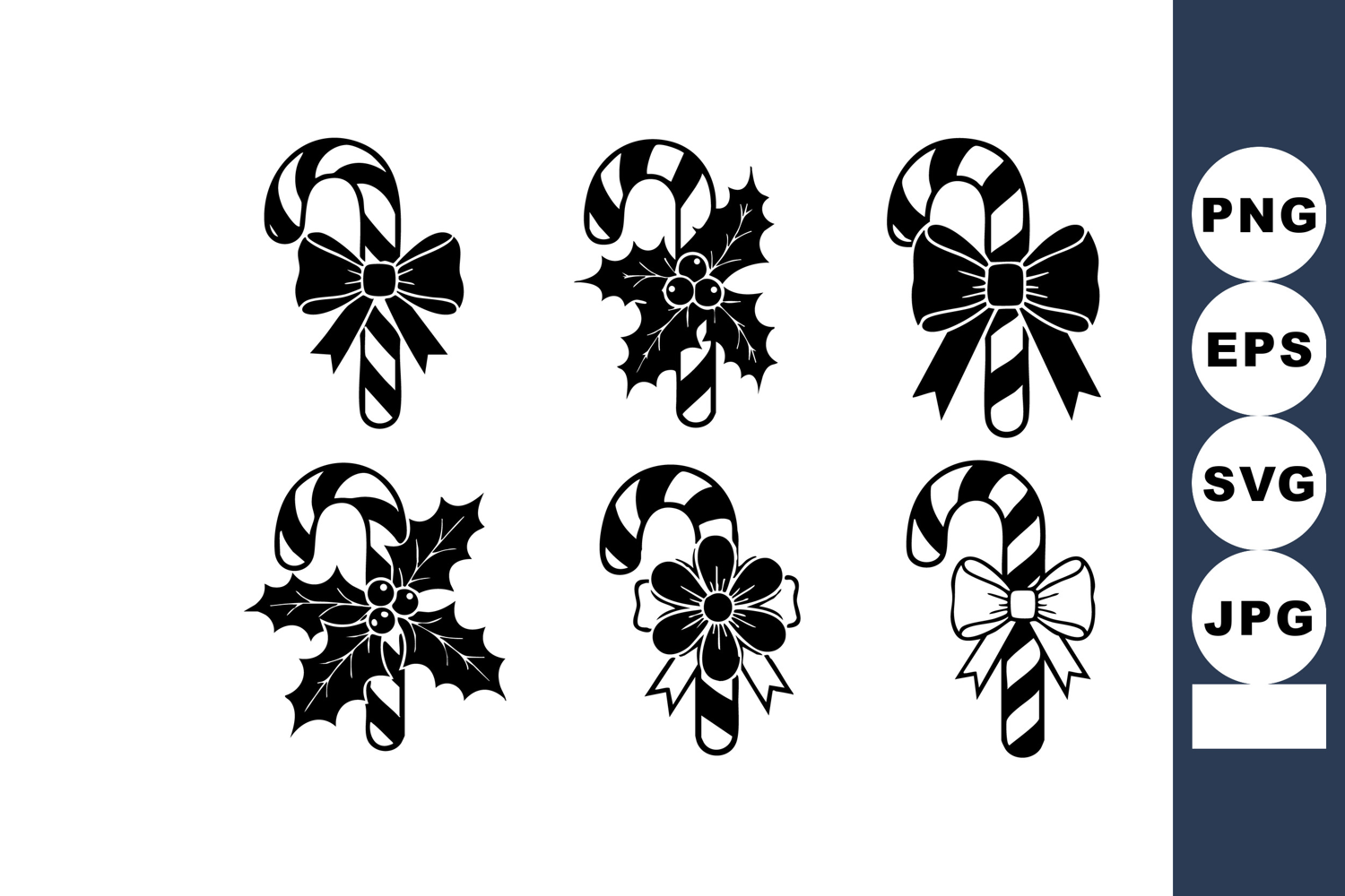 Vector set features six candy cane icons decorated with holly leaves and bows, ideal for festive Christmas designs, joyful mood.