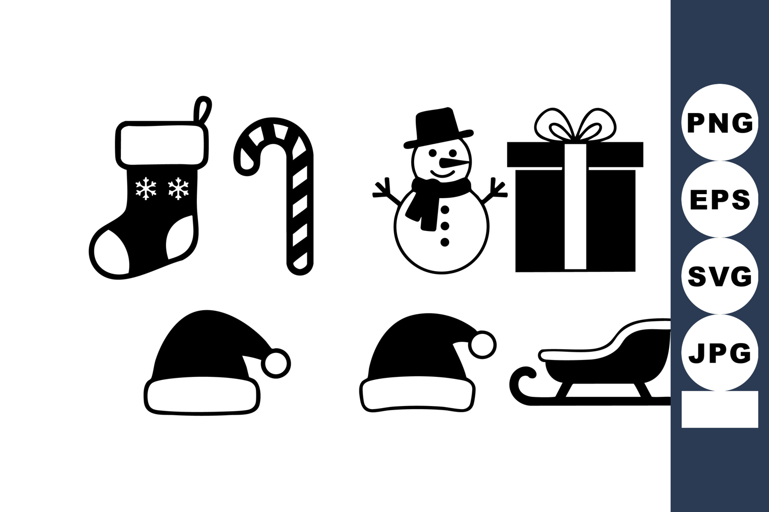 Black and white Christmas holiday icons feature stocking, candy cane, snowman, gift box, Santa hats, and sleigh in a simple festive style. Cheerful.
