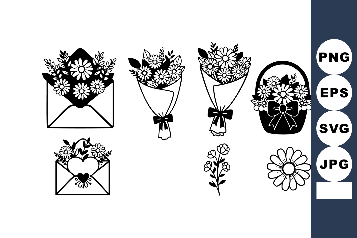Vector illustration shows floral bouquets, flower basket, envelopes with flowers, and daisy blooms in black silhouette style, creating charming mood.