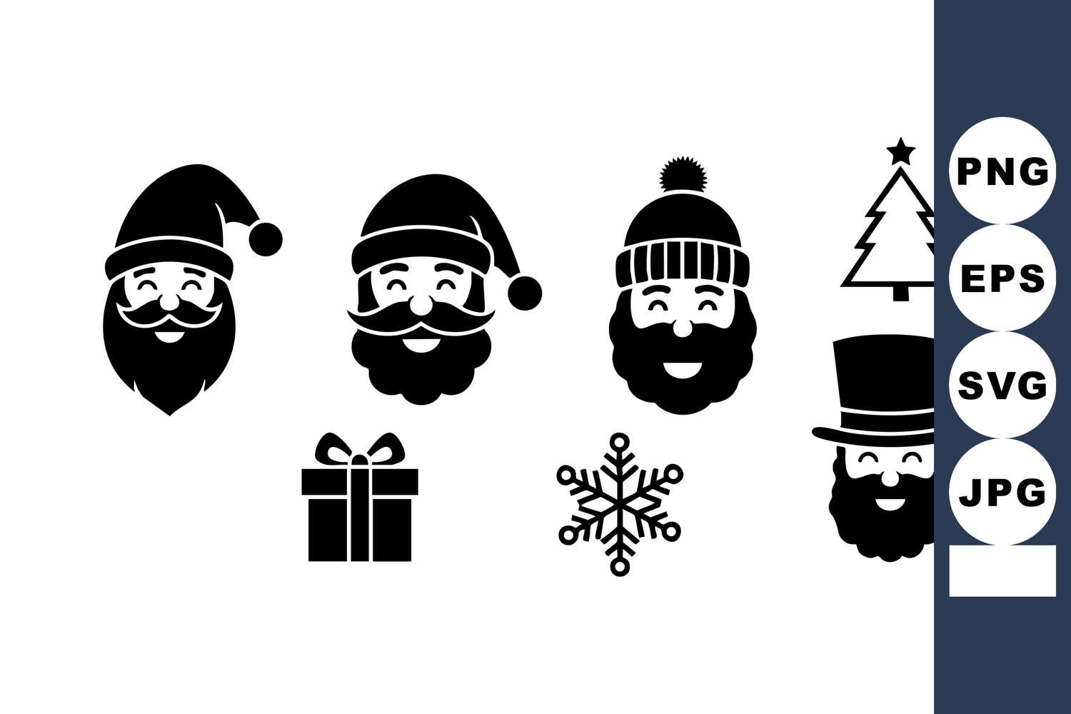 Collection of black silhouette Christmas holiday bearded men with hats, gift box, snowflake, and tree icons in vector style, festive mood.