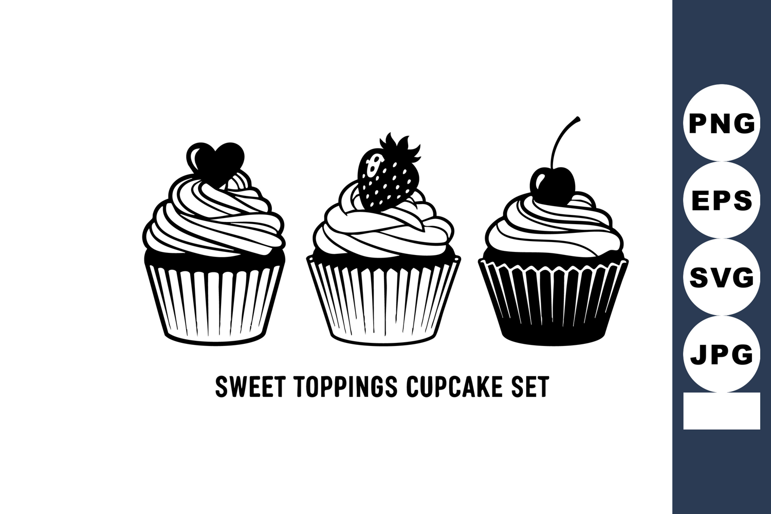 Black and white vector illustration shows three cupcakes with sweet toppings including heart, strawberry, and cherry in a simple style. Cheerful.