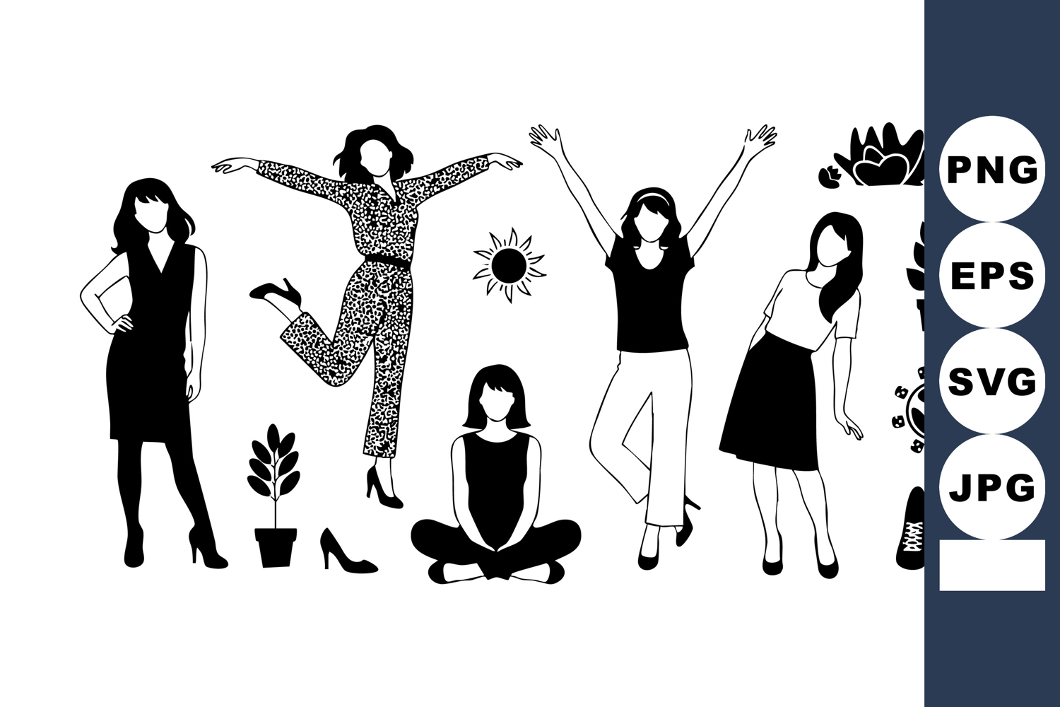 Vector illustration shows women silhouettes with plants, sun, and nature elements in black and white, creating a calm and balanced mood.