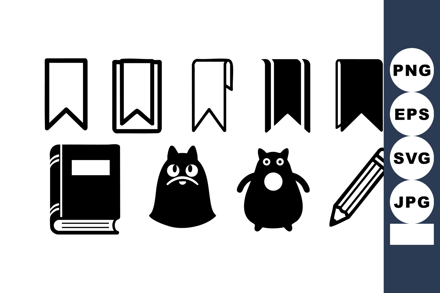 This vector shows black bookmark icons, a book, cartoonish cats, and a pencil in simple silhouette style. Clean and minimalistic design. Calm.