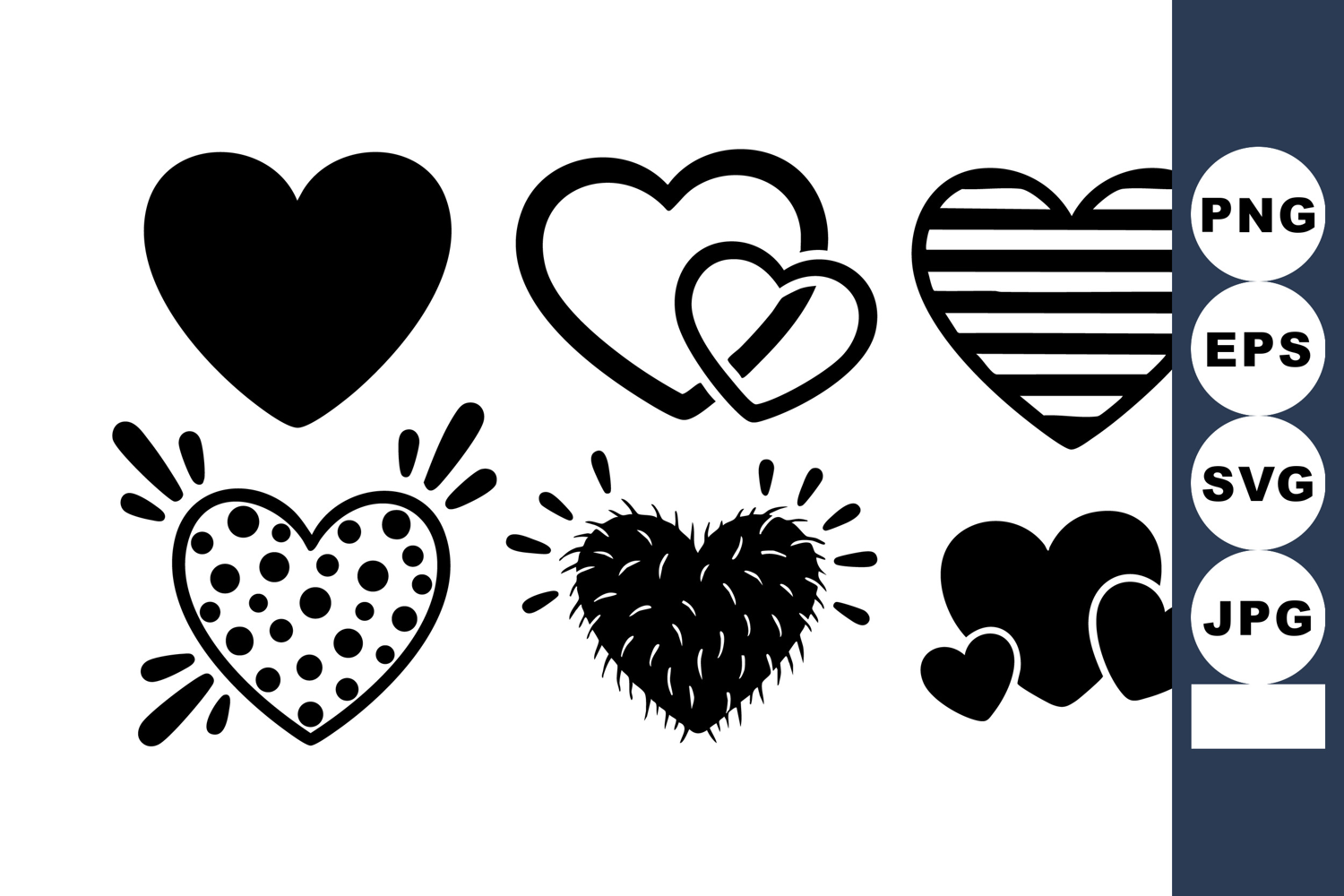 Vector file shows six black and white heart shapes with different patterns and effects, suitable for romantic or love-themed designs, simple and bold mood.