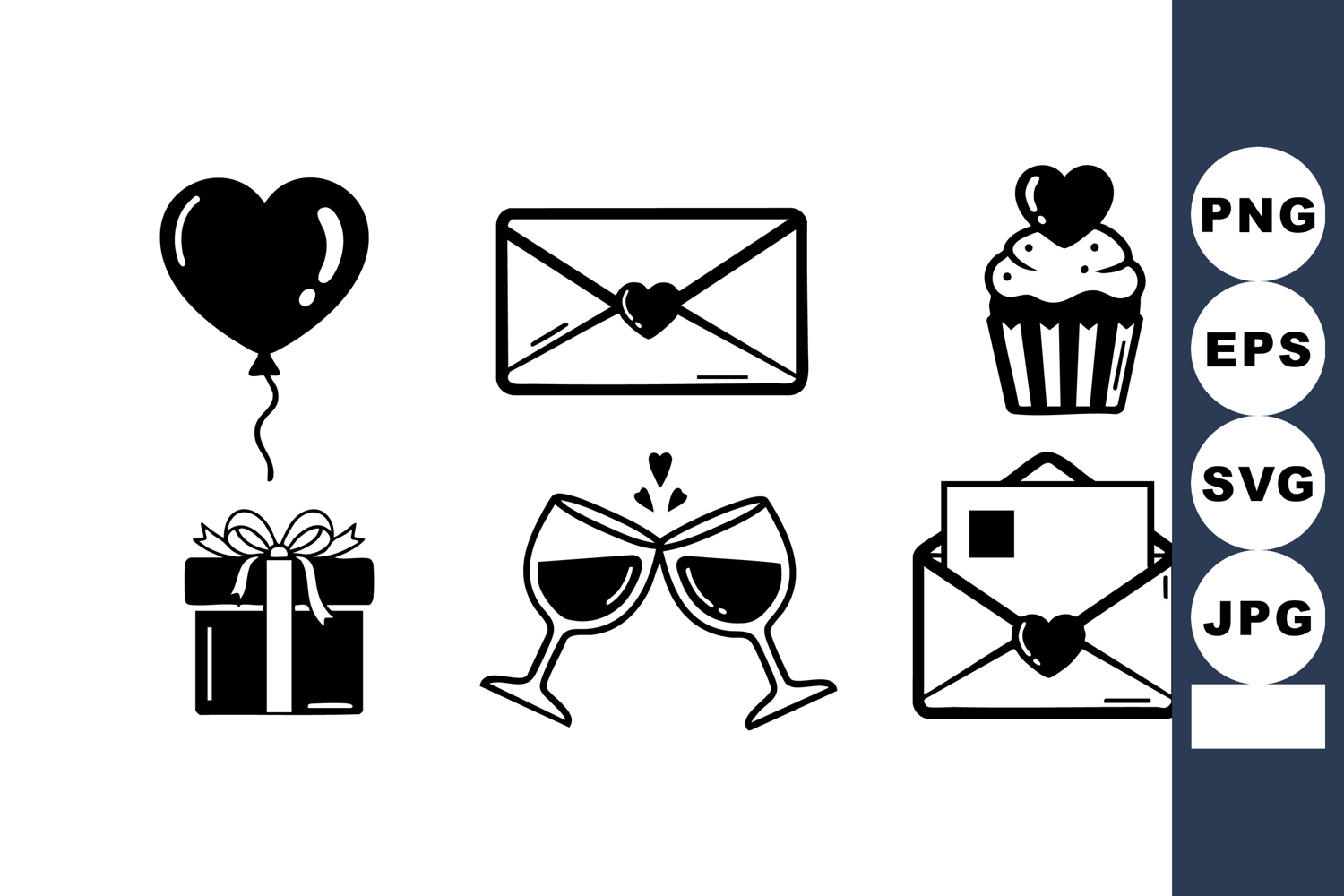 Vector illustration shows black heart balloon, love letters, cupcake, gift box, and clinking glasses in simple style, evoking romantic and festive mood.