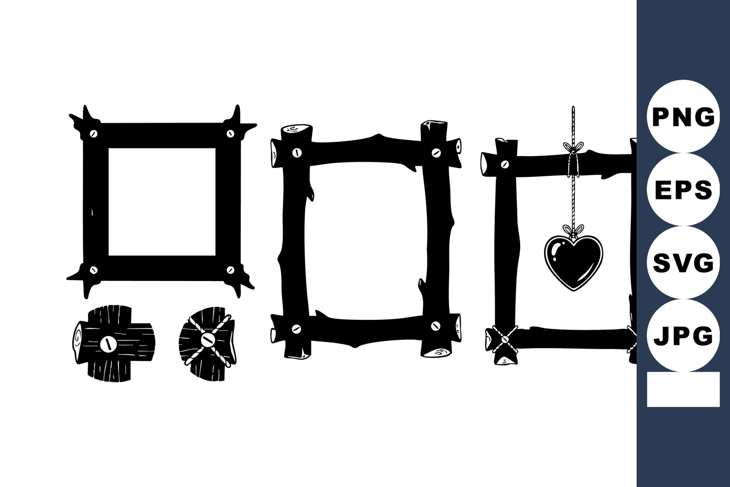 Three rustic wooden frames with a hanging heart pendant and floral details in black silhouette style, presented in a landscape format. Calm mood.