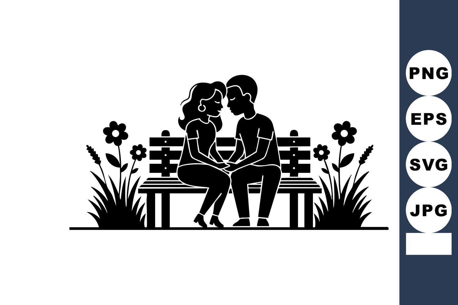 Silhouette of romantic couple sitting closely on a park bench holding hands with flowers around, conveying love and intimacy mood.