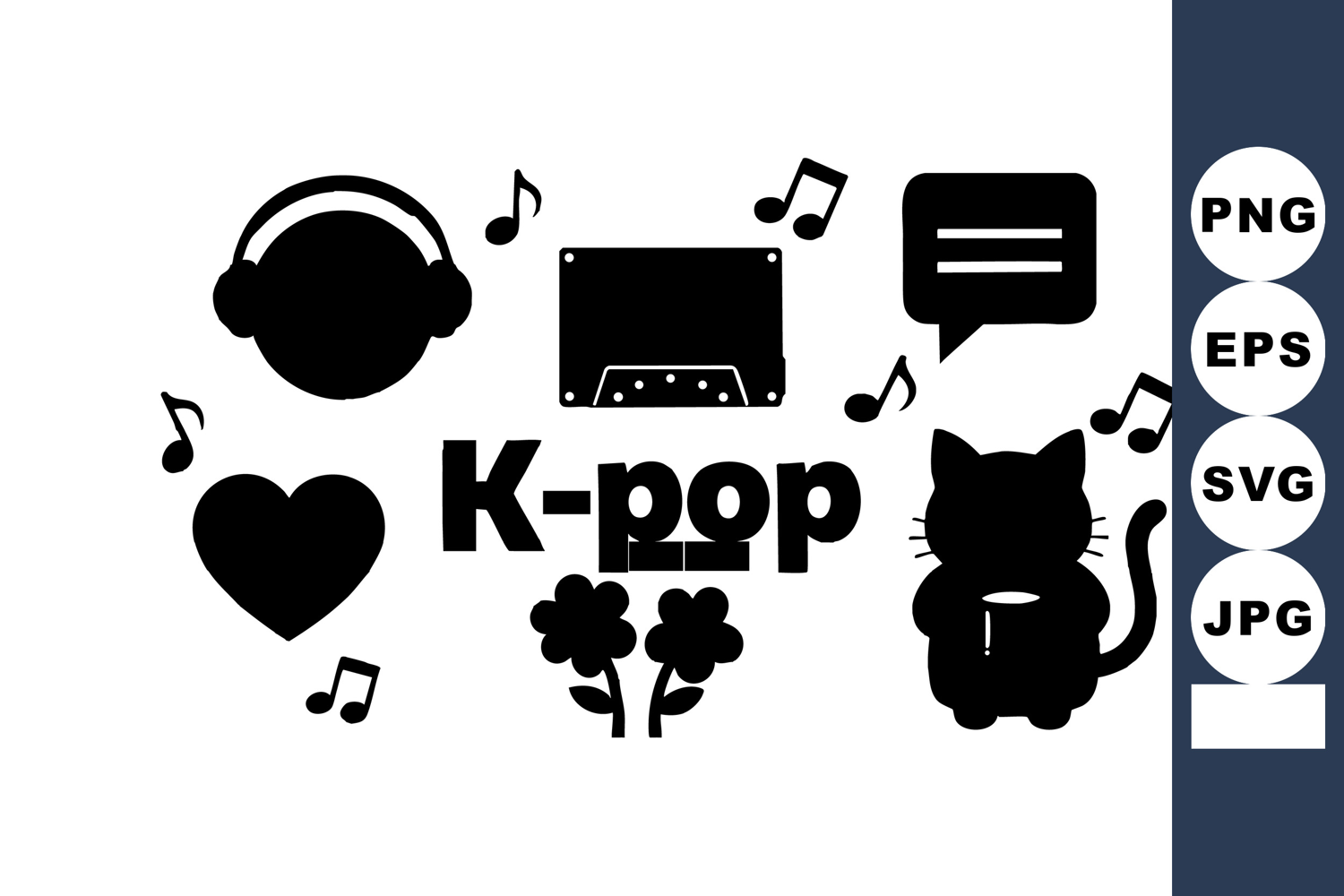 Vector illustration shows K-pop theme with cassette, headphones, cat, heart, flowers, speech bubble, and music notes in black silhouette style, cheerful.