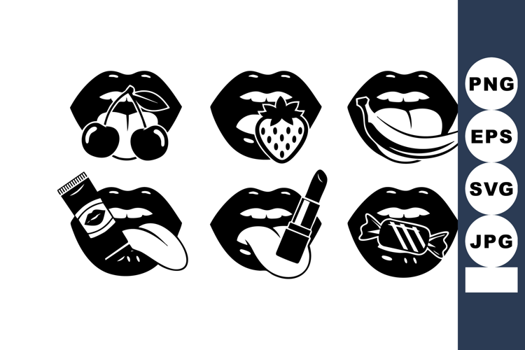 Vector illustration of black lips with cherry, strawberry, banana, lipstick, and candy in a playful style, presenting a bold and artistic mood.