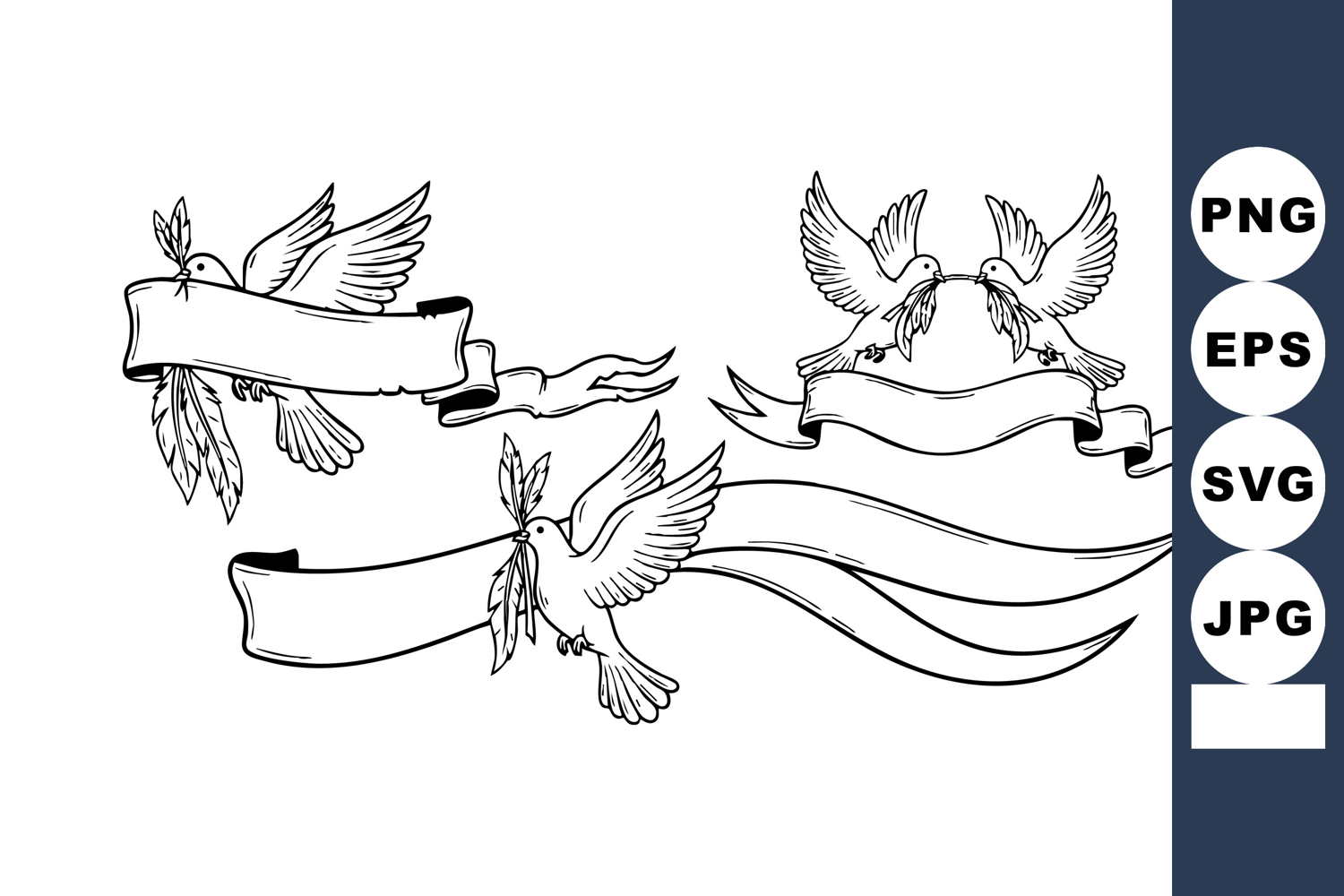 This vector features flying doves clutching blank ribbons and banners in a vintage style, creating a peaceful and elegant mood.