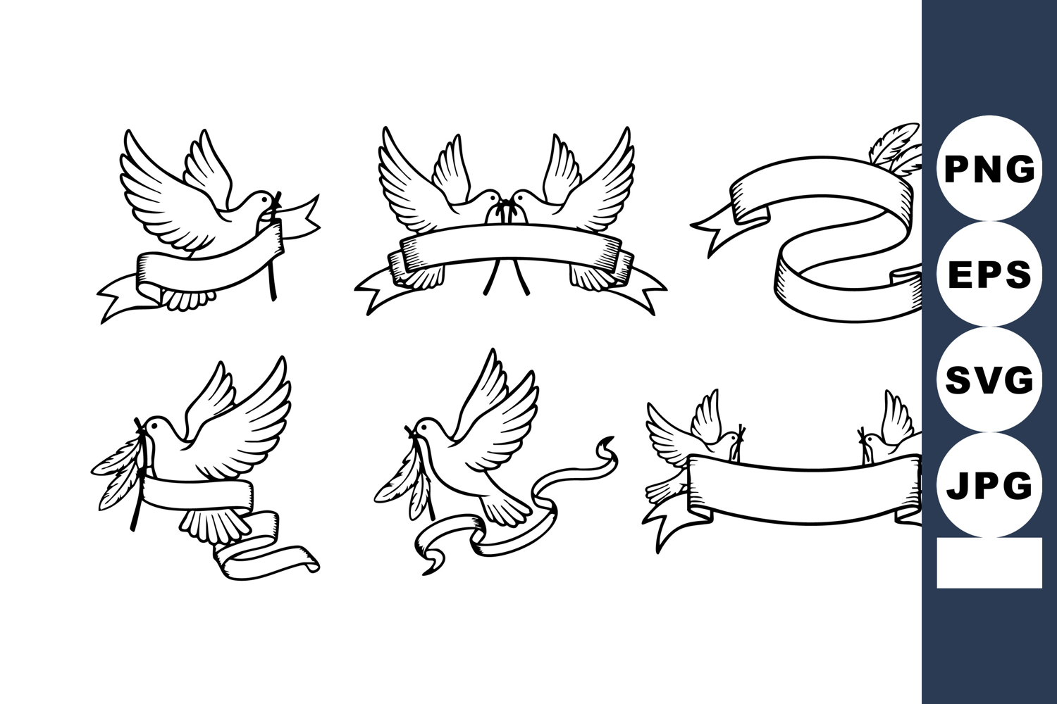 This vector set shows flying doves holding blank ribbons and banners, ready for customization with a clean line art style, peaceful and elegant.