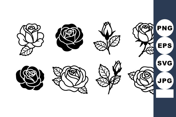 This vector set features various rose flower silhouettes in black and white, showcasing detailed petals and leaves with clean lines. Elegant design.