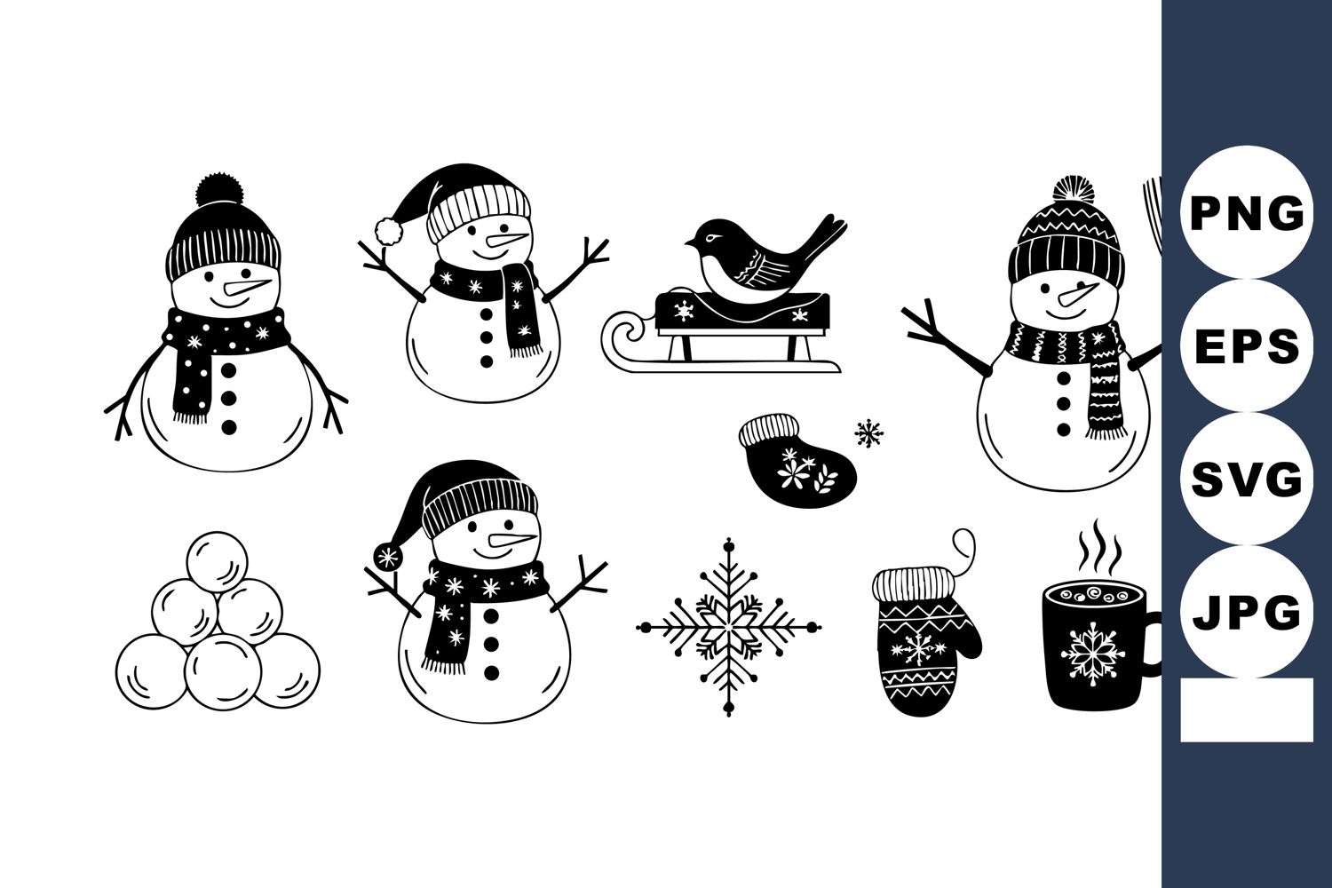 This vector illustration shows snowman characters with winter accessories, sled, bird, mittens, and hot drinks in black and white style, festive mood.