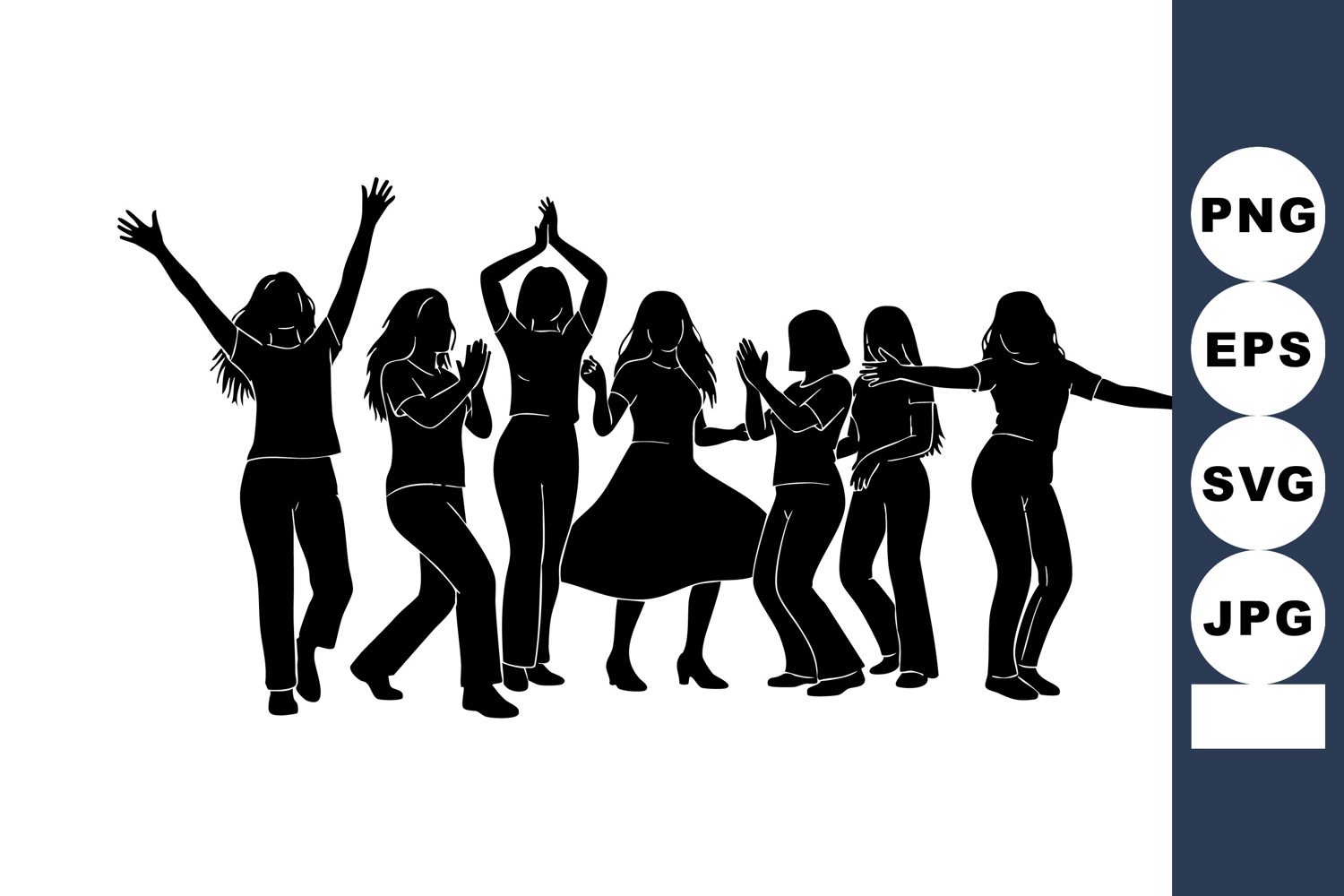 Silhouettes of seven women dancing together in joyful celebration, expressing freedom and happiness with dynamic poses and movement. Energetic mood.