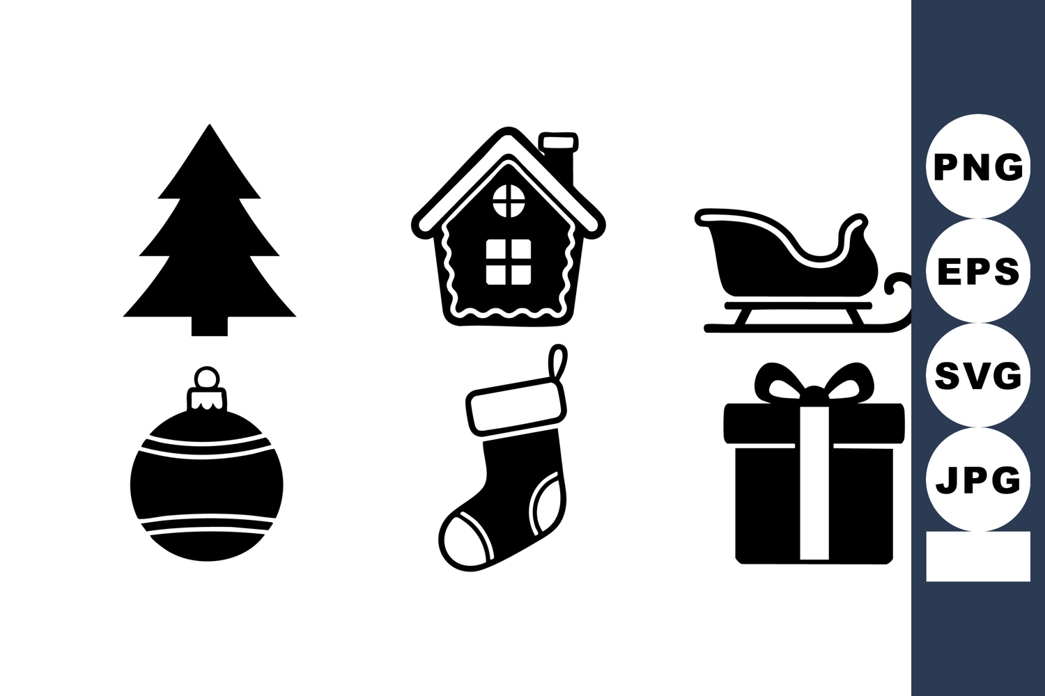 Vector set features black Christmas icons including tree, house, sleigh, ornament, stocking, and gift box in simple style. Festive holiday mood.