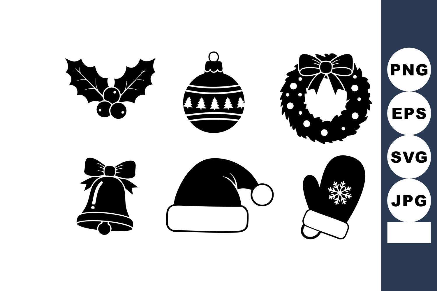 Vector illustration shows black silhouettes of Christmas icons including holly, ornament, wreath, bell, Santa hat, and mitten in a festive mood.