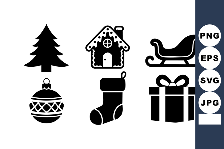 Black silhouette Christmas icons featuring a tree, gingerbread house, sleigh, ornament, stocking, and gift box in simple style, festive mood.