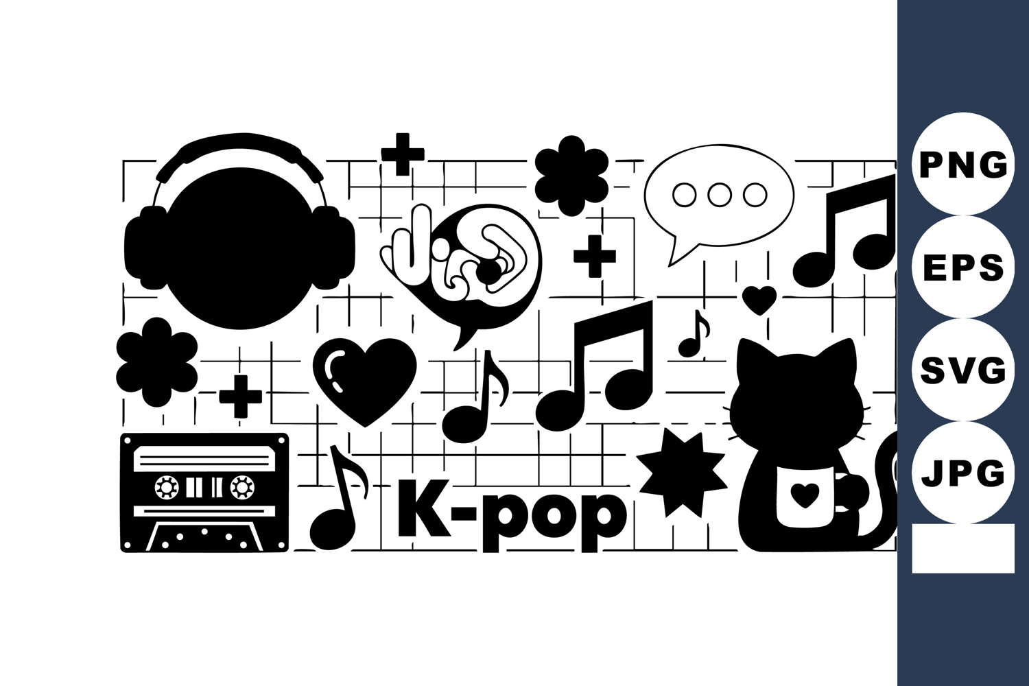 Vector illustration features K-pop music icons including headphones, cat, cassette tape, and music notes in black silhouette style, lively.