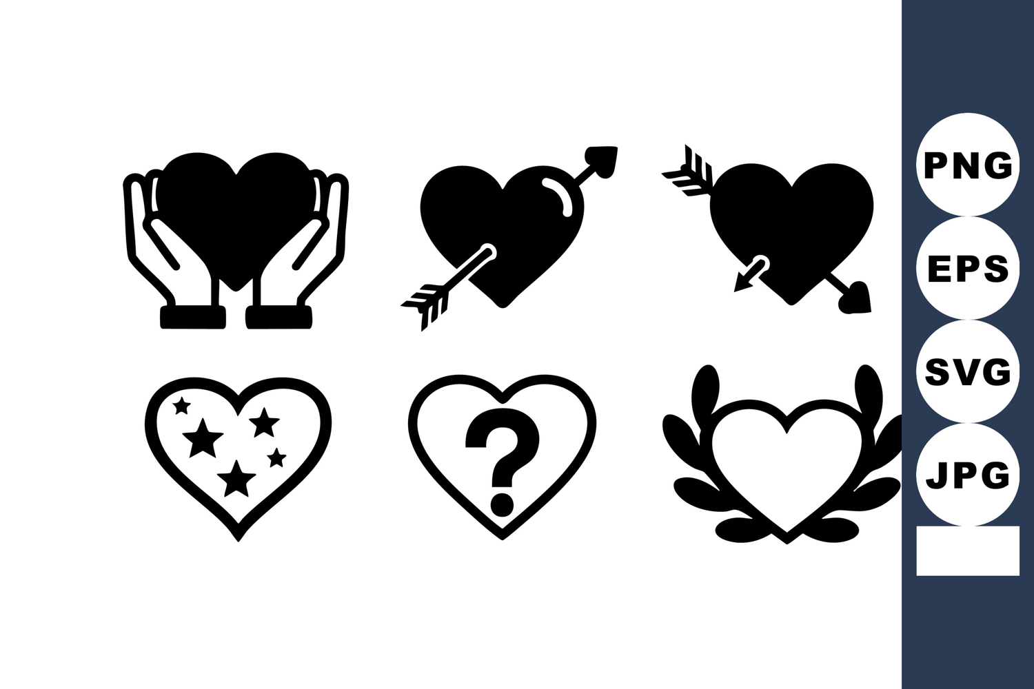 This vector features six black heart and love symbols including arrows, stars, question mark, and hands in a simple style. Calm mood.