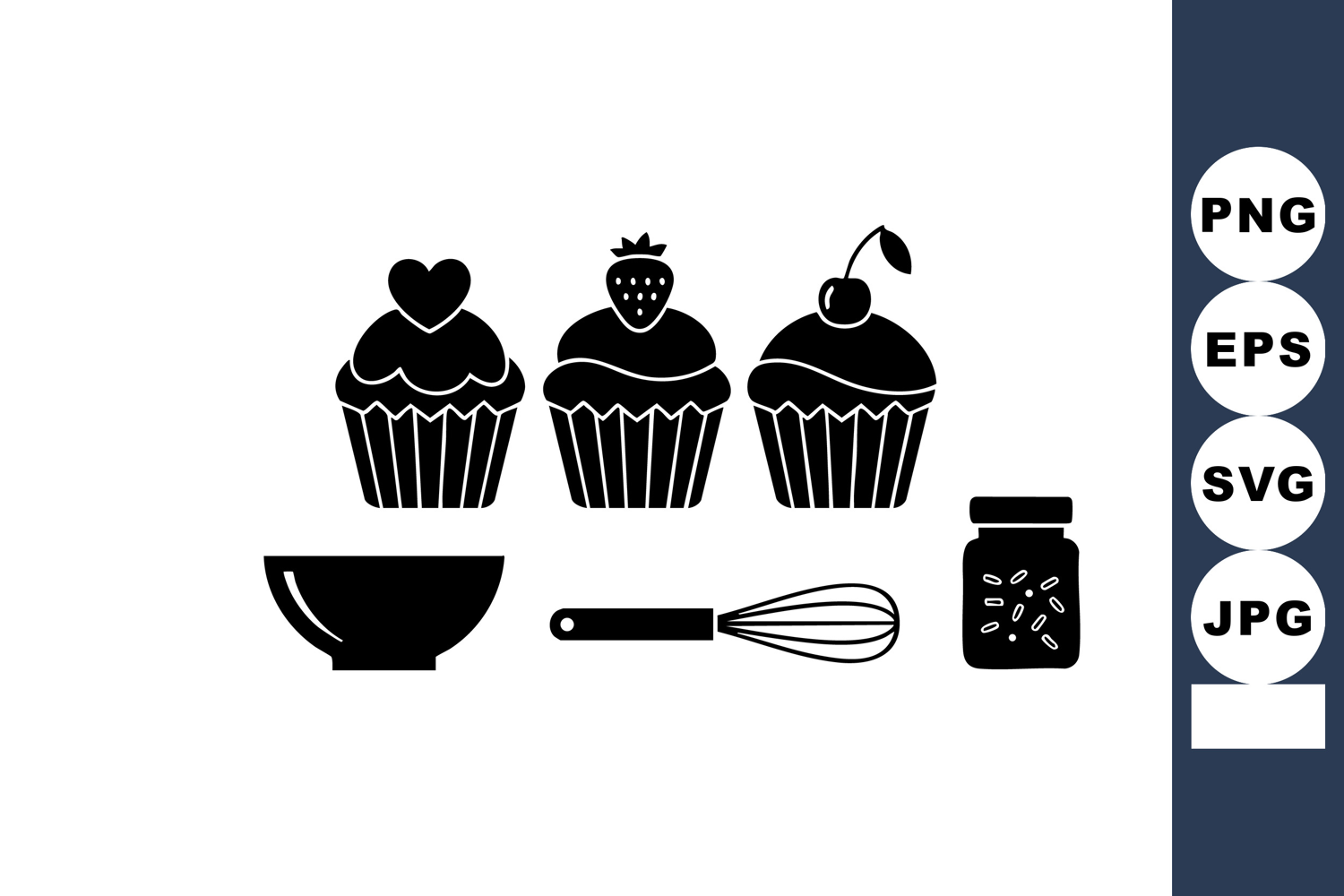 Vector illustration shows cupcakes with a bowl, whisk, and jar of ingredients in black silhouette style, conveying baking concept. Cheerful.