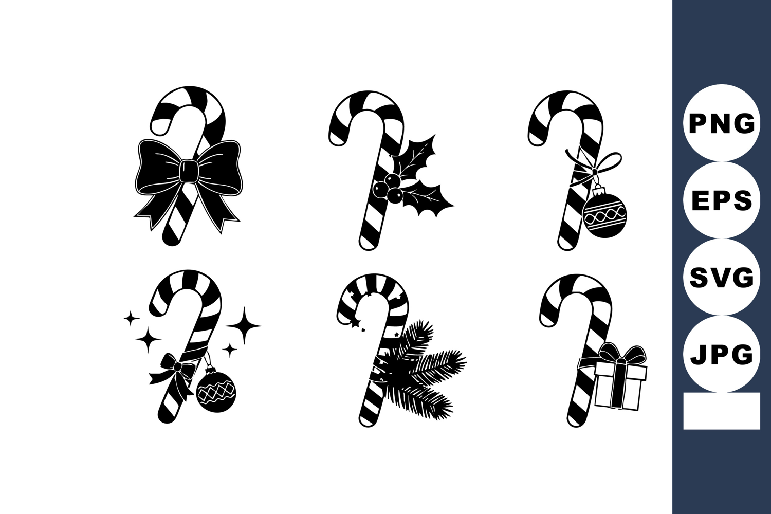 Set of six black and white candy cane vector icons decorated with bows, holly, pine branches, gifts, and ornaments in festive style. Cheerful.