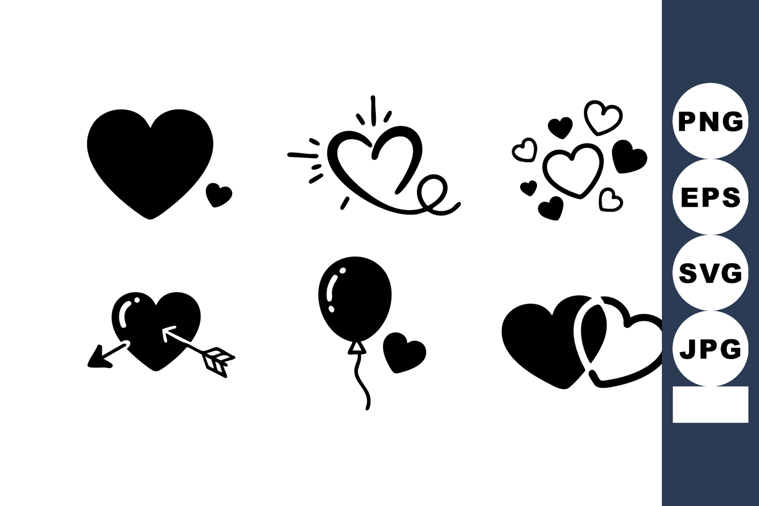 This vector set features heart shapes, love icons, balloon, and arrow elements in a simple black style for romantic and affectionate themes. Cheerful.