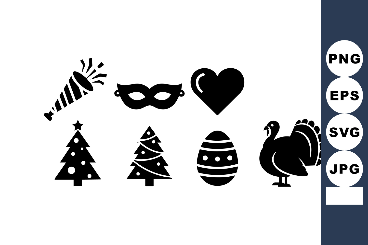 Collection of black festive holiday icons including Christmas trees, party mask, heart, Easter egg, and turkey for celebrations. Cheerful mood.