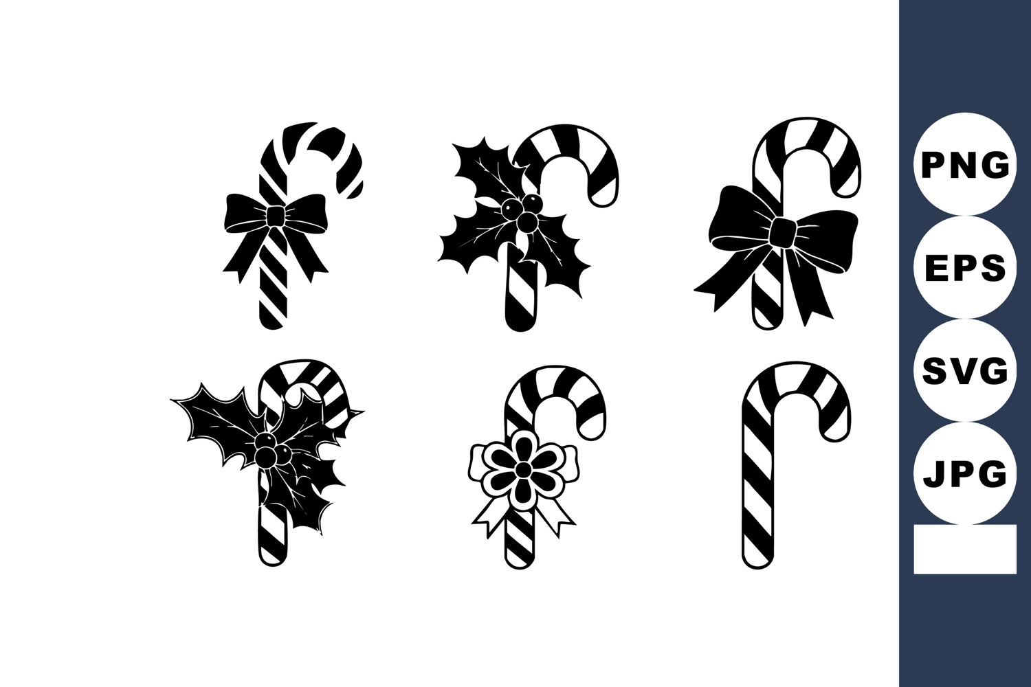 Vector illustration of six candy canes decorated with bows, holly leaves, and flowers symbolizing Christmas holiday cheer and festivity. Cheerful mood.