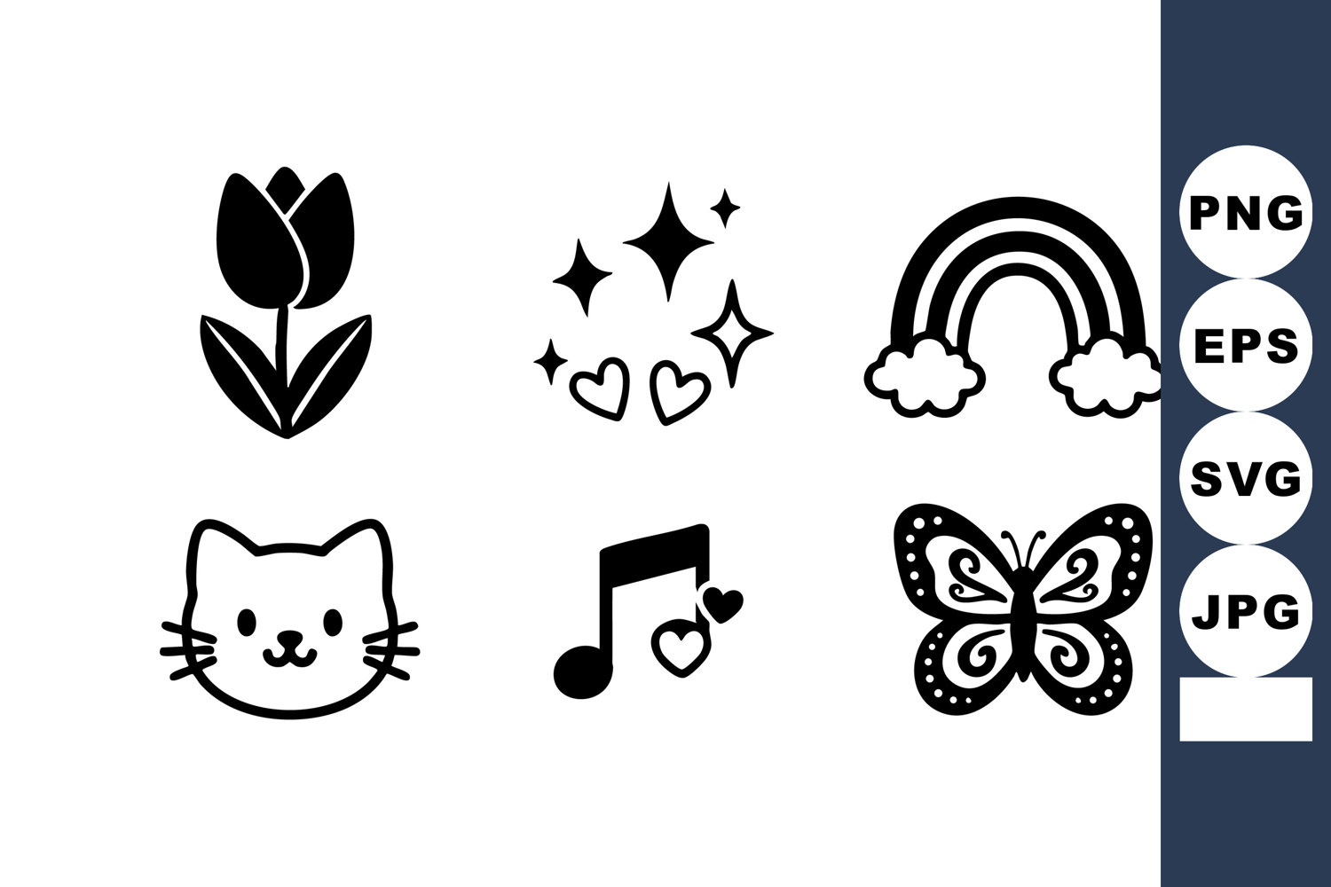 This vector shows six simple black and white icons including a tulip, cat face, butterfly, rainbow, music note, and sparkles with hearts, creating a playful mood.