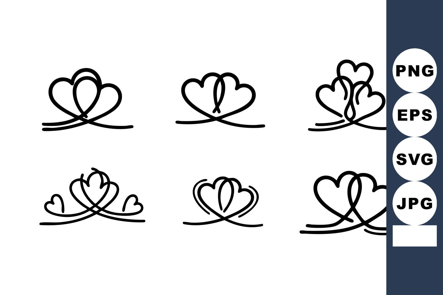 Six simple black vector heart shapes with intertwined lines and love symbols for romantic design projects. Elegant and minimal mood.