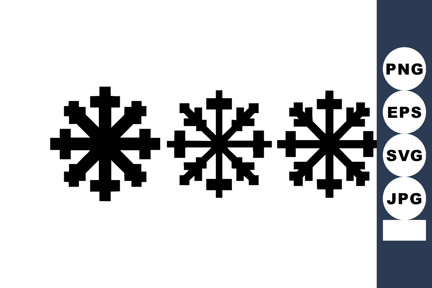 Vector illustration shows three black symmetrical snowflake icons with geometric shapes representing winter season. Clean and simple design, calm mood.