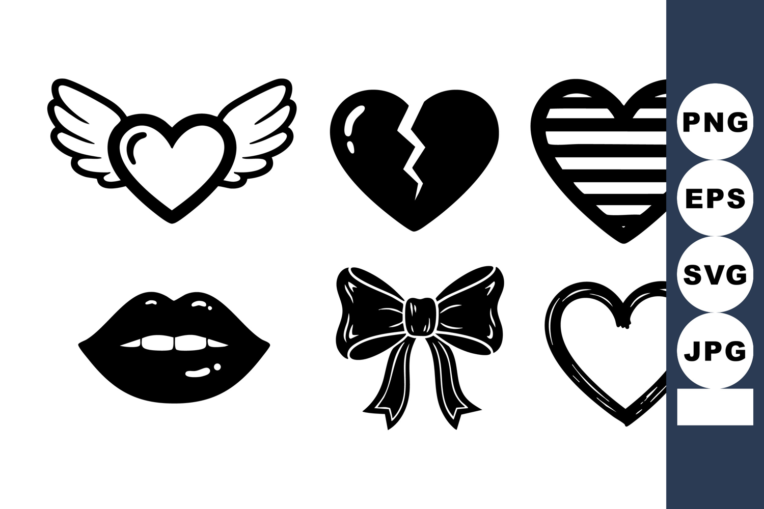 Vector illustration shows six love-themed icons including winged heart, broken heart, striped heart, lips, ribbon bow, and empty heart. Playful mood.