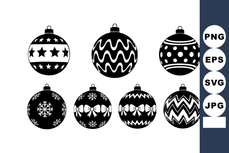 Vector illustration features seven black and white Christmas ornaments with various patterns in a simple style creating festive holiday mood.
