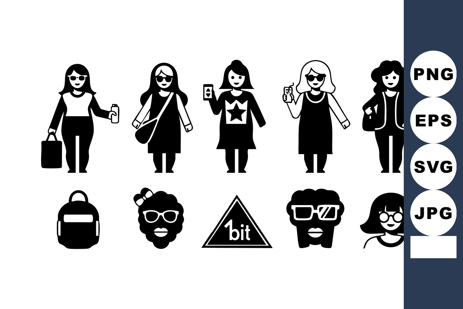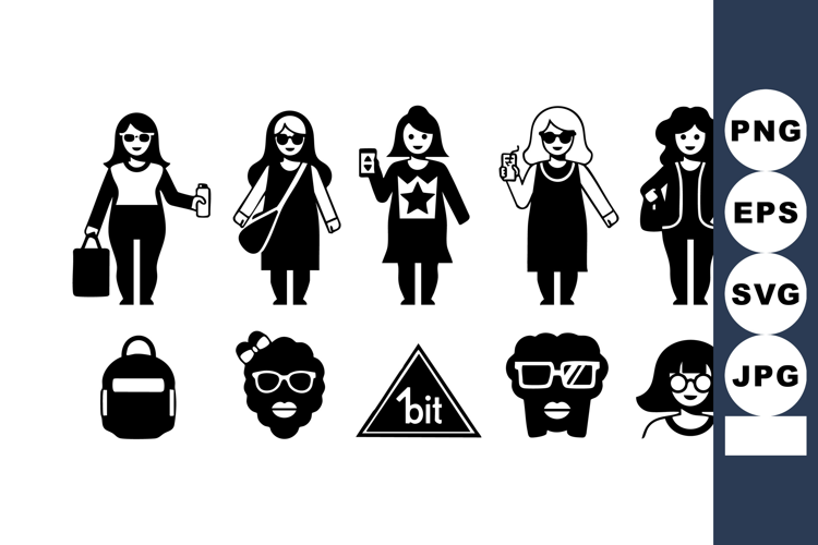 Illustration shows diverse young women with backpacks and sunglasses in black and white style, presenting casual urban lifestyle and confidence. Modern and bold mood.