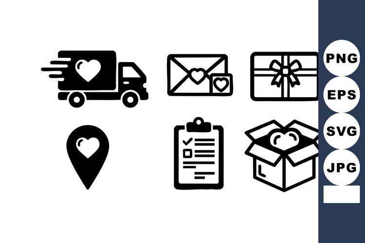 This vector set presents delivery truck, envelope, gift box, location pin, checklist, and open box icons with heart symbols, conveying love and care mood.