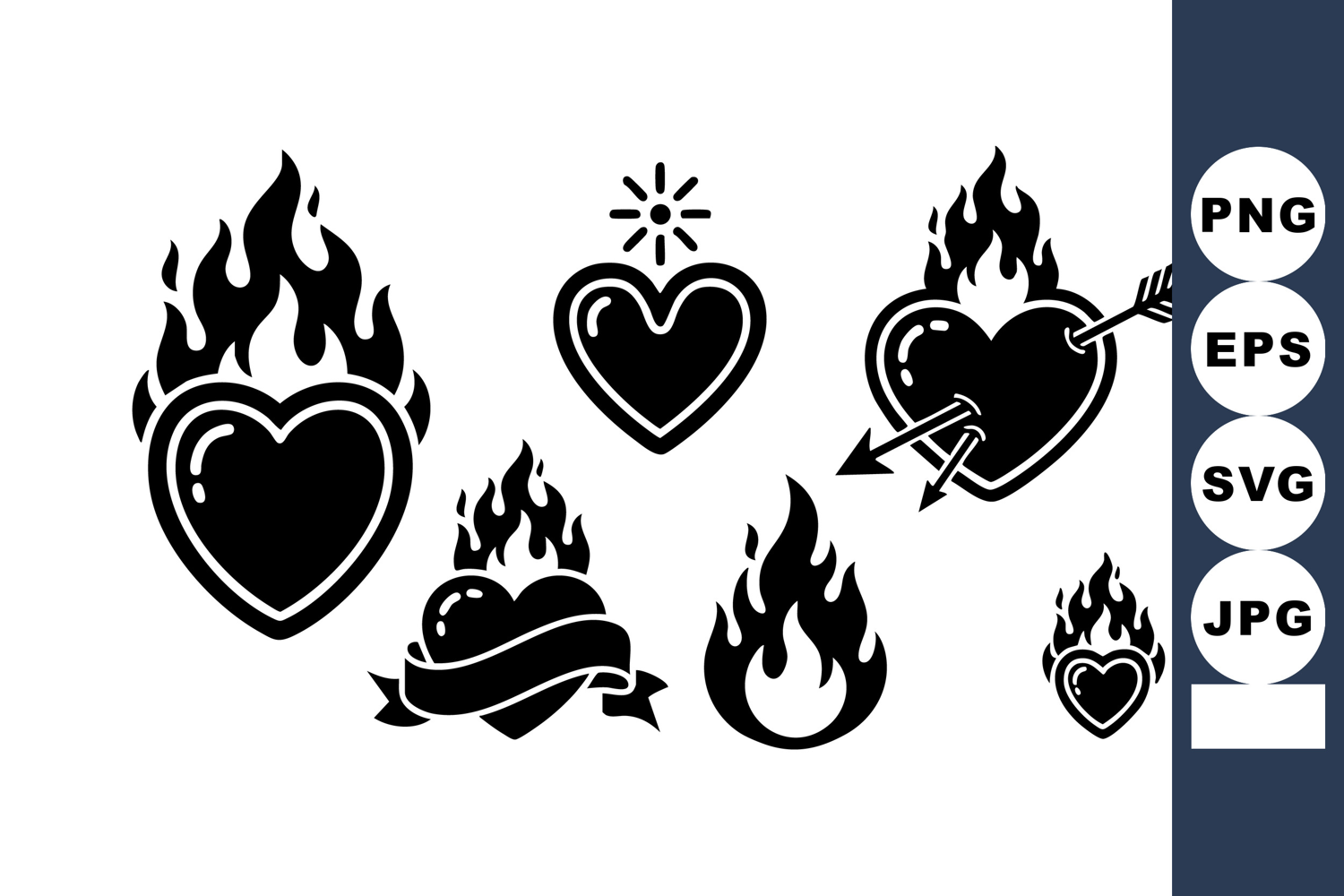 This vector set shows various black burning heart icons with flames and an arrow in a simple silhouette style, evoking passion and intensity mood.