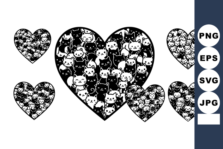 Vector illustration shows multiple heart shapes filled with black and white cat figures in a repeating pattern, creating a playful and charming mood.