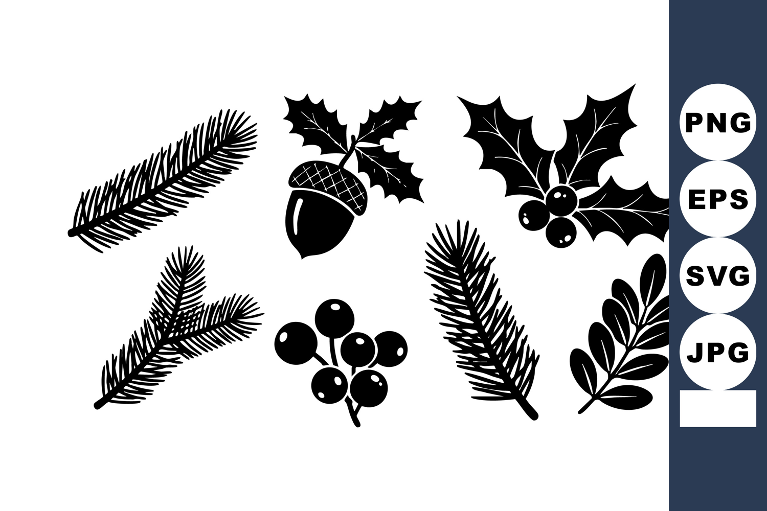 Pine branches holly leaves acorn and berries black silhouett example image 1