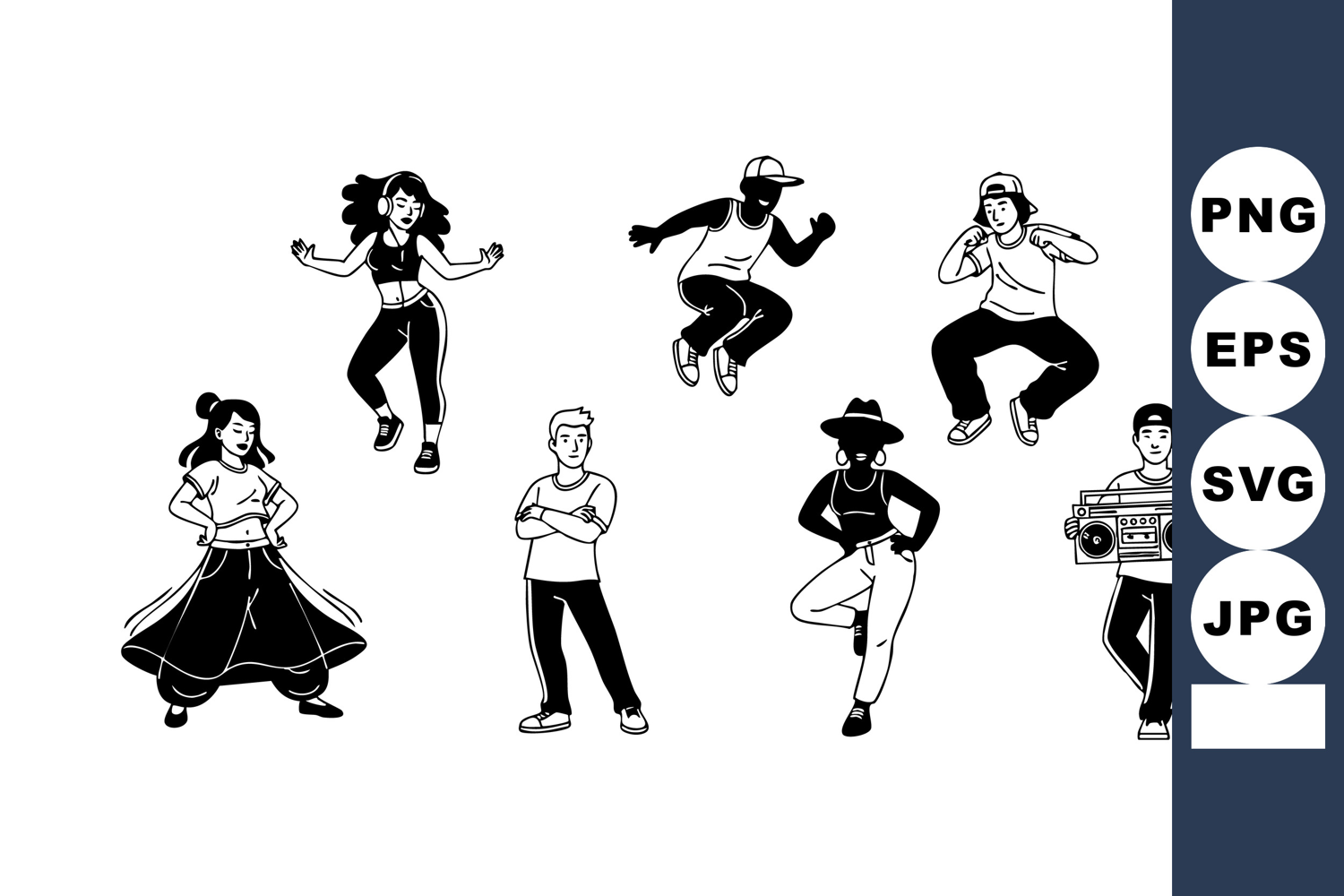 Illustration shows diverse people dancing, posing, and expressing urban street style with lively energy and dynamic movements, creating vibrant mood.
