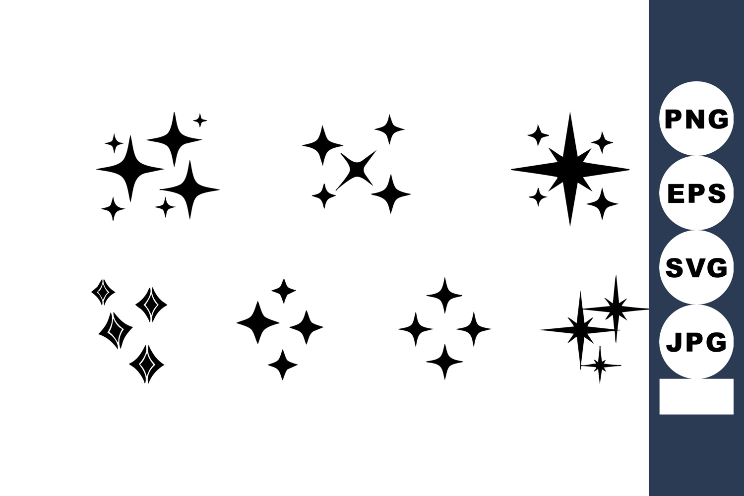 Vector image shows six black sparkle star shapes with shiny effects in various forms, creating a magical and bright atmosphere. Energetic.